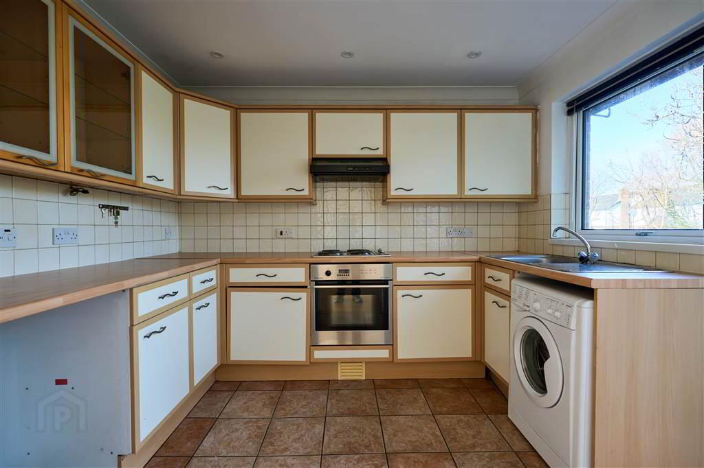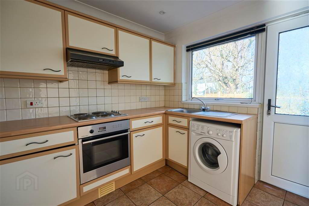 Fitted Kitchen with an excellent range of high and low level units with complimentary Worktops, and integrated Hob with Oven Under, a Stainless Steel Sink Unit and plumbed for a Washing Machine. Complete with tiled floor, part tiled walls and a door leads to the Rear Garden.