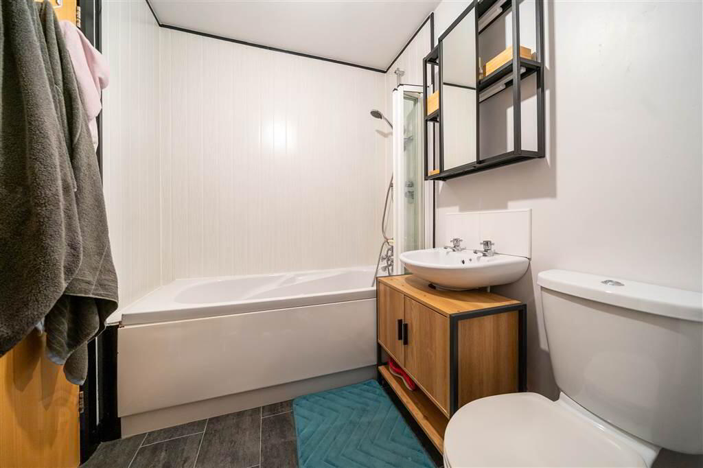 White three-piece suite comprising a Push Button W.C. a Pedestal Wash Hand Basin and a Panel Bath with mains Shower attachment and PVC Panel surround.