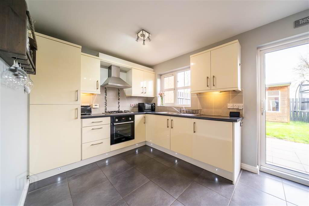 Modern fitted Kitchen with a range of high and low level gloss units with complimentary Worktops, a Stainless Steel Sink Unit, an integrated Gas Hob with Oven under, an integrated Fridge / Freezer and an integrated Washing Machine. Complete with tiled Flooring. The Kitchen opens to provide space for dining, access to a Ground Floor W.C. and sliding doors to the Rear Garden.