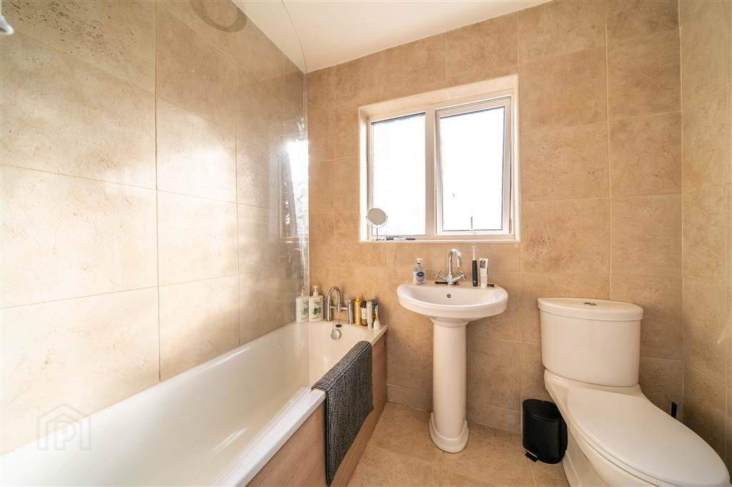 Fully tiled Bathroom with a white three-piece suite comprising a Push Button W.C., a Pedestal Wash Hand Basin and a Panel Bath with Mains Shower Unit.