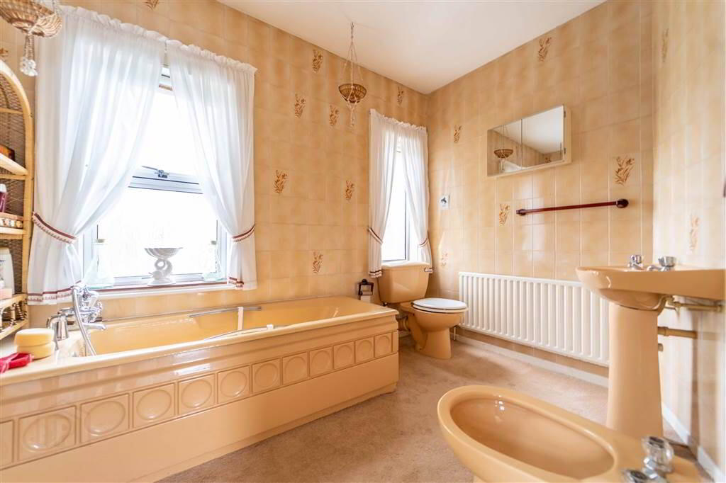 Five-piece Suite comprising a Bath with a Telephone Shower over, a Bidet, a W.C., a Pedestal Wash Hand Basin and a Mains Shower Cubicle. Complete with Tiled Walls, access to Hot-press and Roof space.