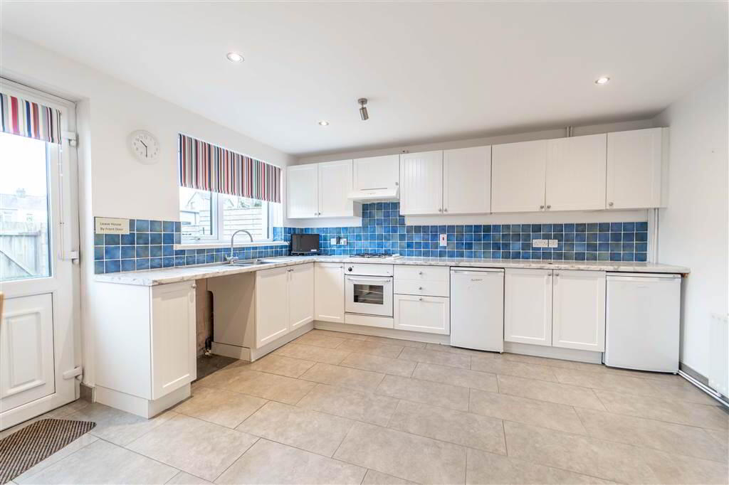 Fitted Kitchen with a range of high- and low-level Units with complimentary roller edge Worktops, a 1 & ½ Bowl Stainless Steel Sink and Drainer Unit, Plumbed for a Washing Machine, an Integrated Four Ring Gas Hob with Oven Under and Extractor over. Complete with Tiled Flooring, part Tiled Walls, recessed Spotlights, access to built-in Storage and access to the rear via a uPVC and Glazed Door.