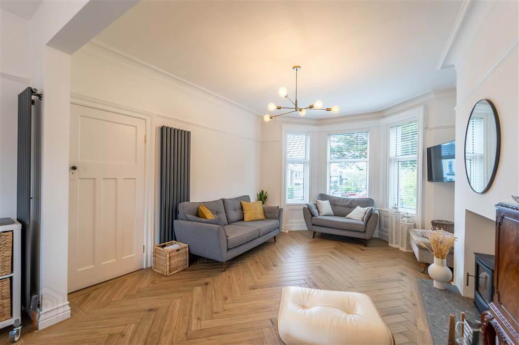 A bright and spacious front aspect Reception Room with a feature Bow Bay Window. Complete with Tiled Herringbone Flooring and a feature Fireplace hosting a Wood Burning Stove with a Tiled Hearth. Open plan to: