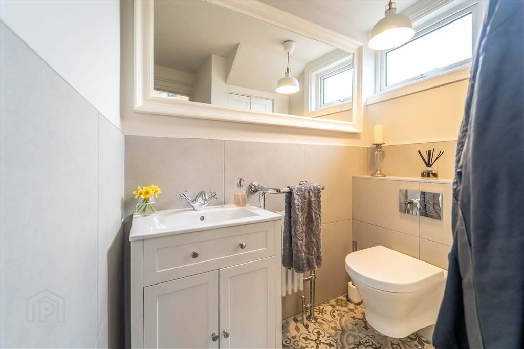 Two-piece Suite comprising a Low Flush W.C. and a Sink with a Vanity Unit under. Complete with Tiled Flooring, part Tiled Walls and access to under Stair Storage.
