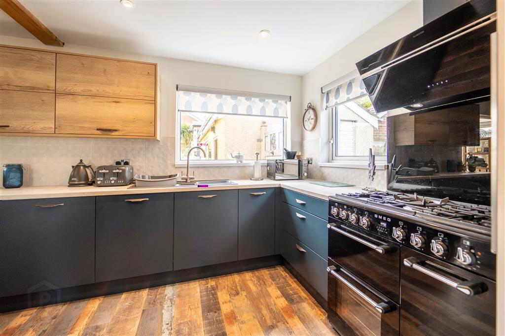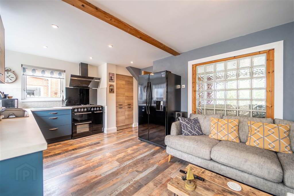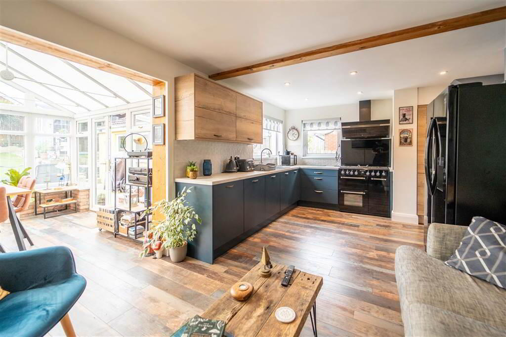 Contemporary styled fitted Kitchen with an excellent range of high and low level units with complimentary Worktops. Plumbed for a Gas Range and fitted with an integrated Dishwasher. Provides ample space for Dining and is open plan to: - CONSERVATORY: