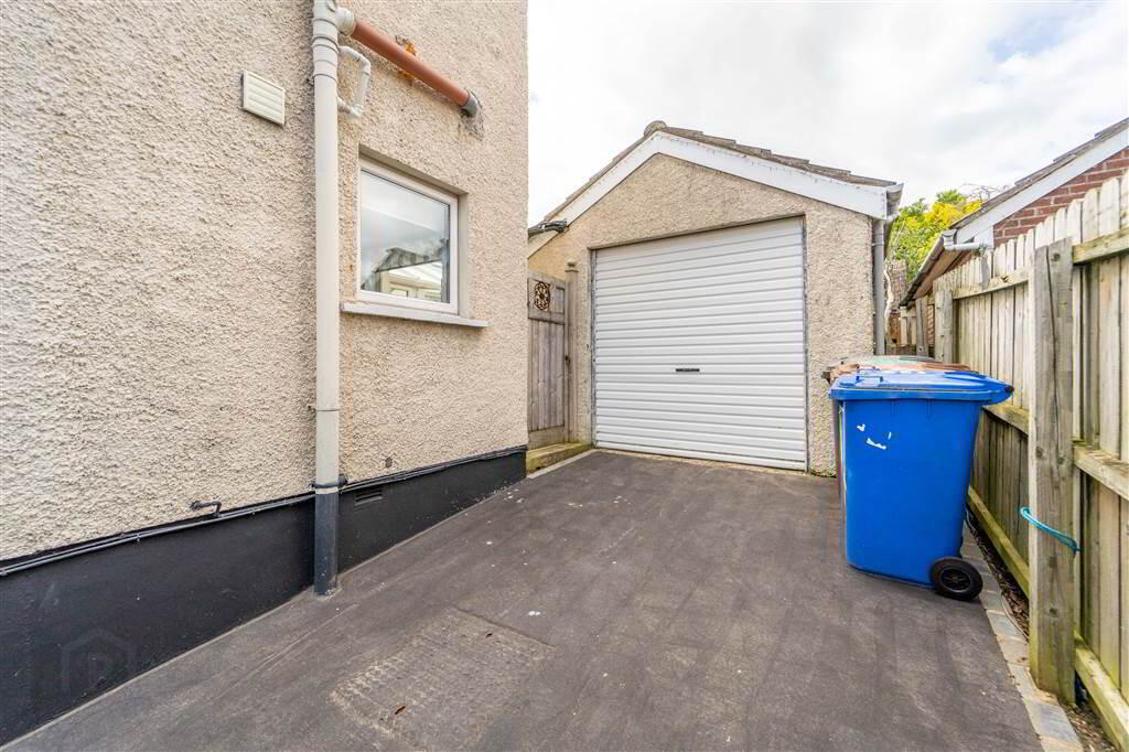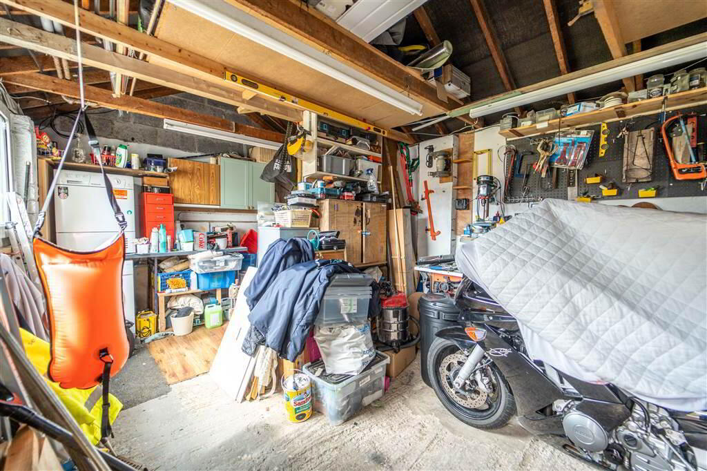 Spacious Detached Garage with a Roller Shutter Door, Light, Power and is plumbed for utilities. Separate pedestrian access from the Rear Garden.