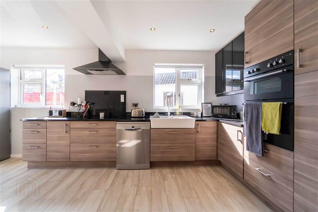 Modern fitted Kitchen with a range of high and low level units with feature stone Worktops, a ceramic twin Sink, an integrated Hob, an integrated double Oven and is plumbed for a Dishwasher. Laminate Wooden floor continued from the Living area and the Kitchen provides space for dining as well as access to the rear through a sliding door.