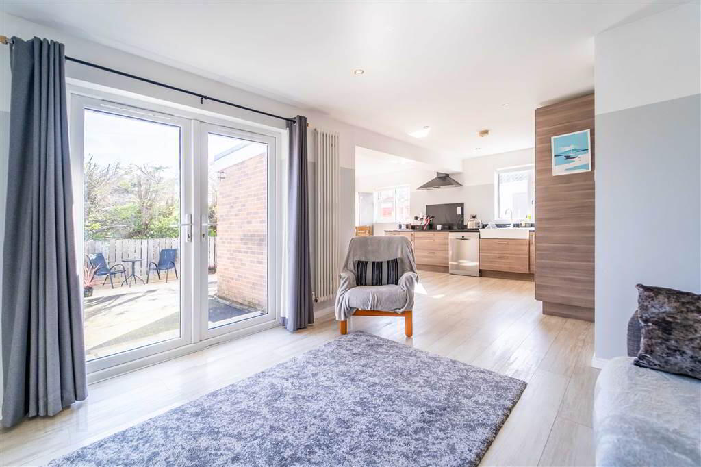 Rear aspect Reception Area with Laminate Wooden Flooring and Patio Doors leading to the Rear. ‘L’ Shaped Open Plan to: