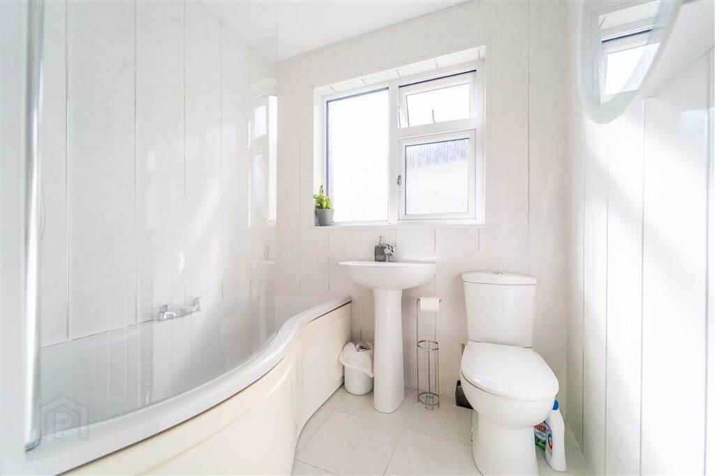 Modern fitted Bathroom with a white three-piece suite comprising a Push Button W.C., a Pedestal Wash Hand Basin and a Panel Bath with an Electric Shower Unit. Complete with PVC wall panels and tiled floor.