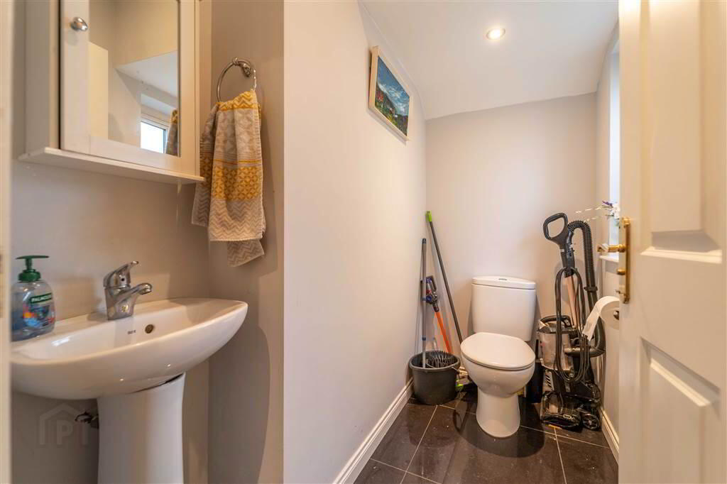 Access from the Utility Room, white suite comprising a Pedestal Wash Hand Basin and a Push Button W.C. Tiled floor continued from the Utility Room.